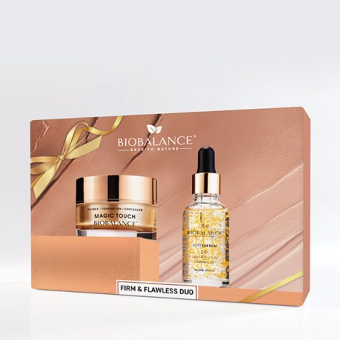 BioBalance Magic Touch комплект 2 части комбинира стягащ серум с 24K злато и пептиди 30мл. и изглаждащ крем/основа Magic Touch 30мл. за равномерен, сияен и подмладен вид на кожата.