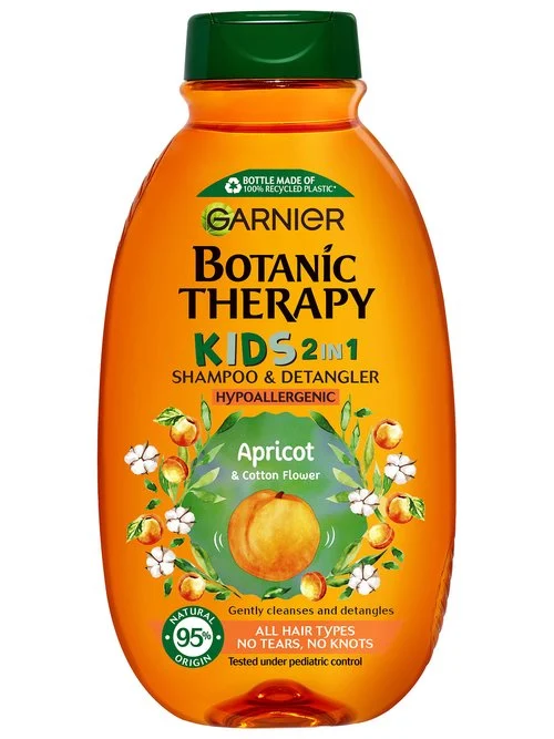 Поглези детската коса с Garnier Botanic Therapy Kids 2в1 Apricot & Cotton Flower – хипоалергенен шампоан и балсам с 95% съставки от естествен произход. Формулата с екстракт от кайсия и памучен цвят почиства нежно и омекотява, като същевременно улеснява разресването 💧.