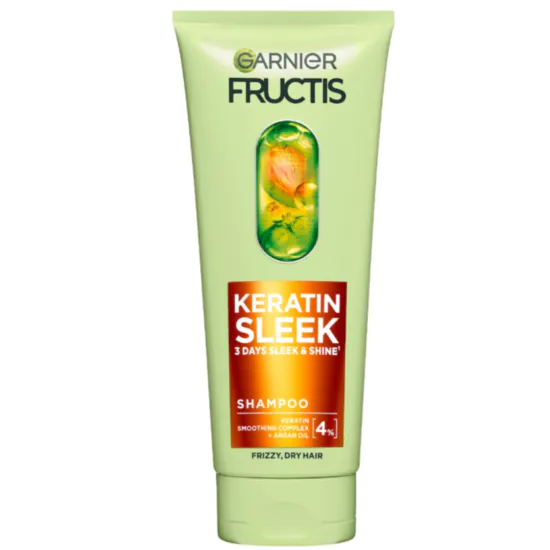 Garnier Fructis Keratin Sleek шампоан за коса 200 мл е специално създаден за гладка, мека и блестяща коса. Формулата е обогатена с кератин и растителни активни съставки, които подхранват косъма, укрепват го и намаляват накъсването и цъфтящите краища.