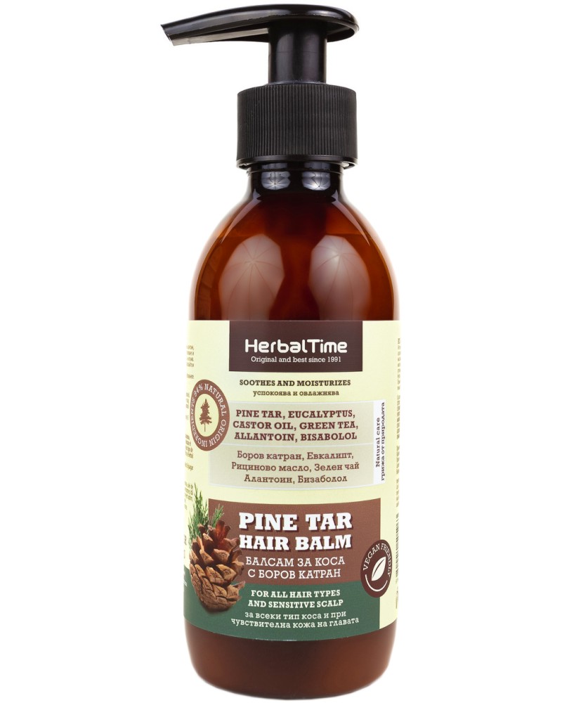 Herbal Time балсам с боров катран 240 мл е подхранващ балсам, подходящ за коса и скалп, склонни към пърхот и раздразнения. Формулата с боров катран успокоява, хидратира и подпомага възстановяването на скалпа, като оставя косата мека и лесна за разресване.